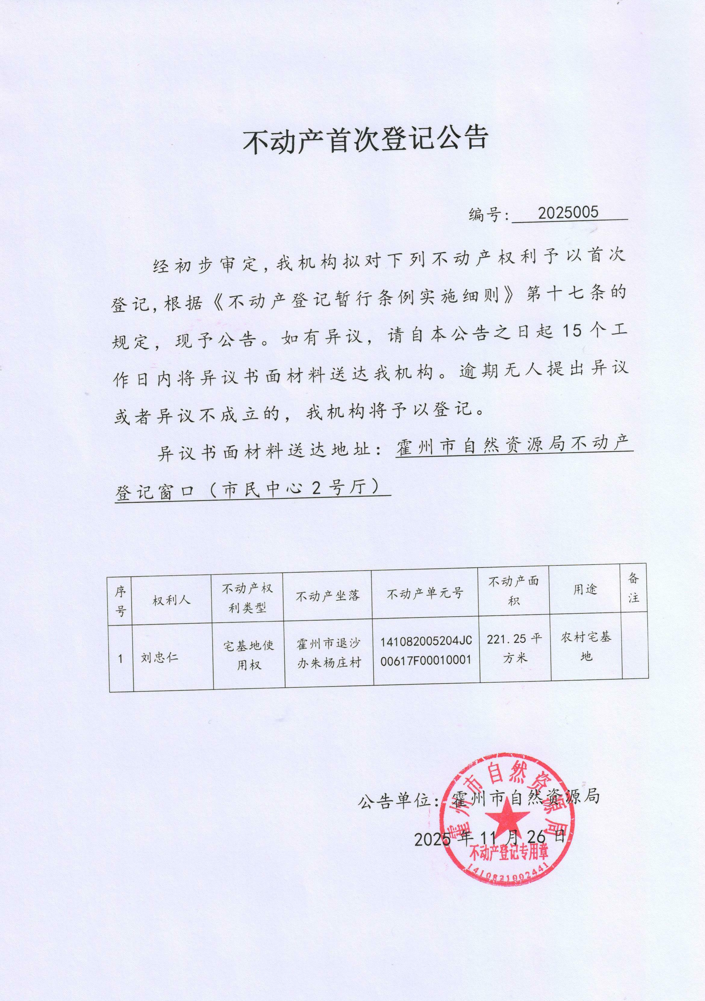 不动产首次登记公告(2025005)